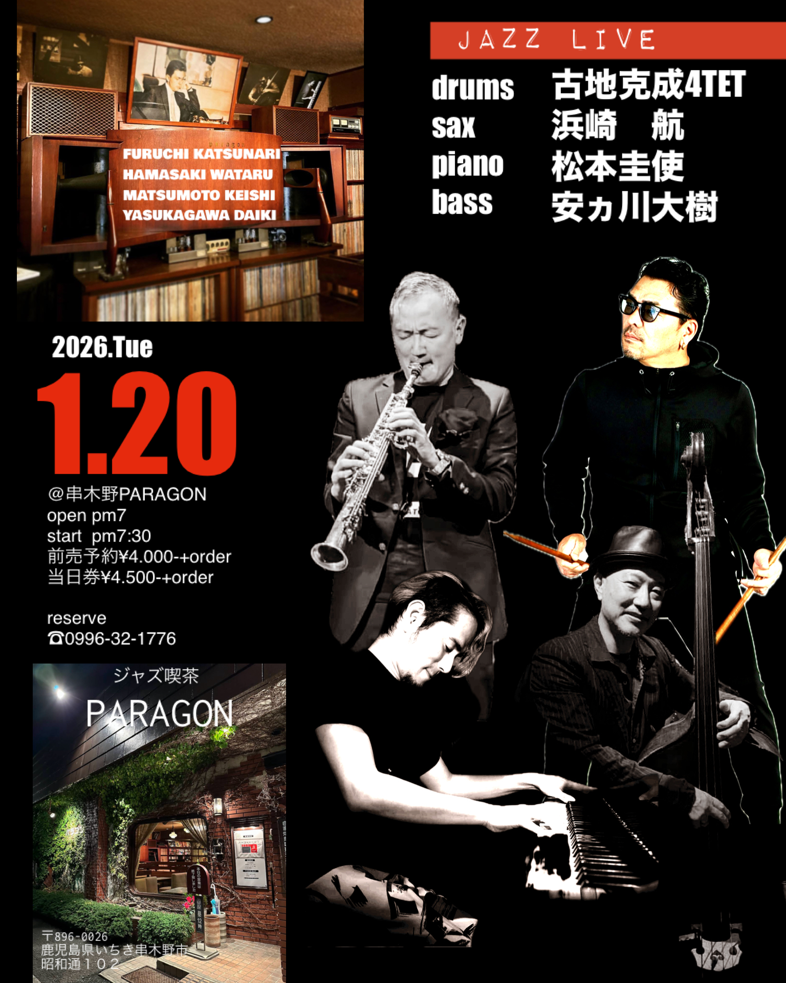 2026 1.20(Tue)@串木野PARAGON 出演 古地克成(ds)4TET 浜崎航(sax)松本圭使(pf)安ヵ川大樹(db)
