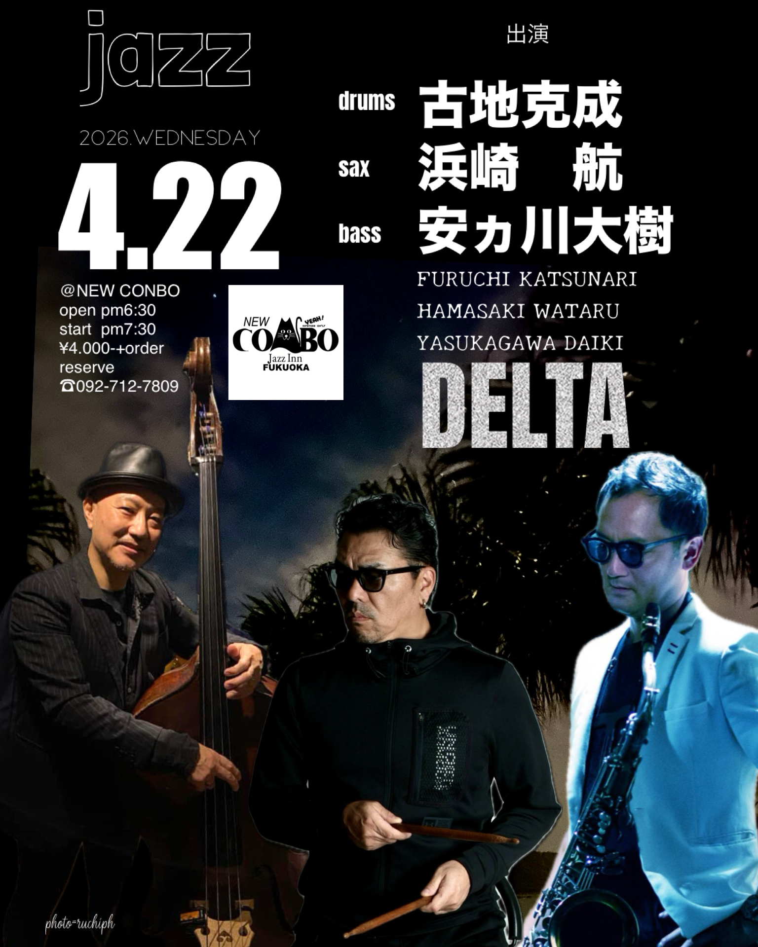 2026 4.22(wed)@博多NEW COMBO 出演 古地克成(ds)TRIO 浜崎航(sax)安ヵ川大樹(db)
