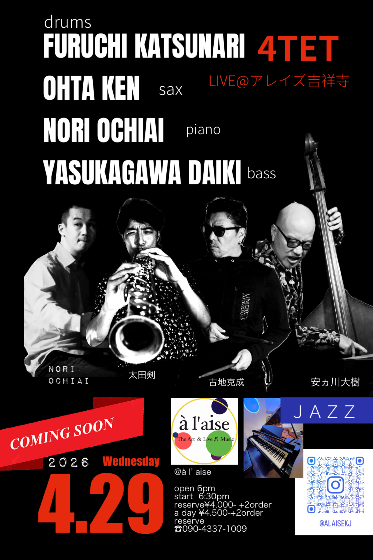 2026 4.29(Wed)@吉祥寺アレイズ 出演 古地克成(ds)4TET 太田剣(sax)NORI OCHIAI(pf)安ヵ川大樹(db)