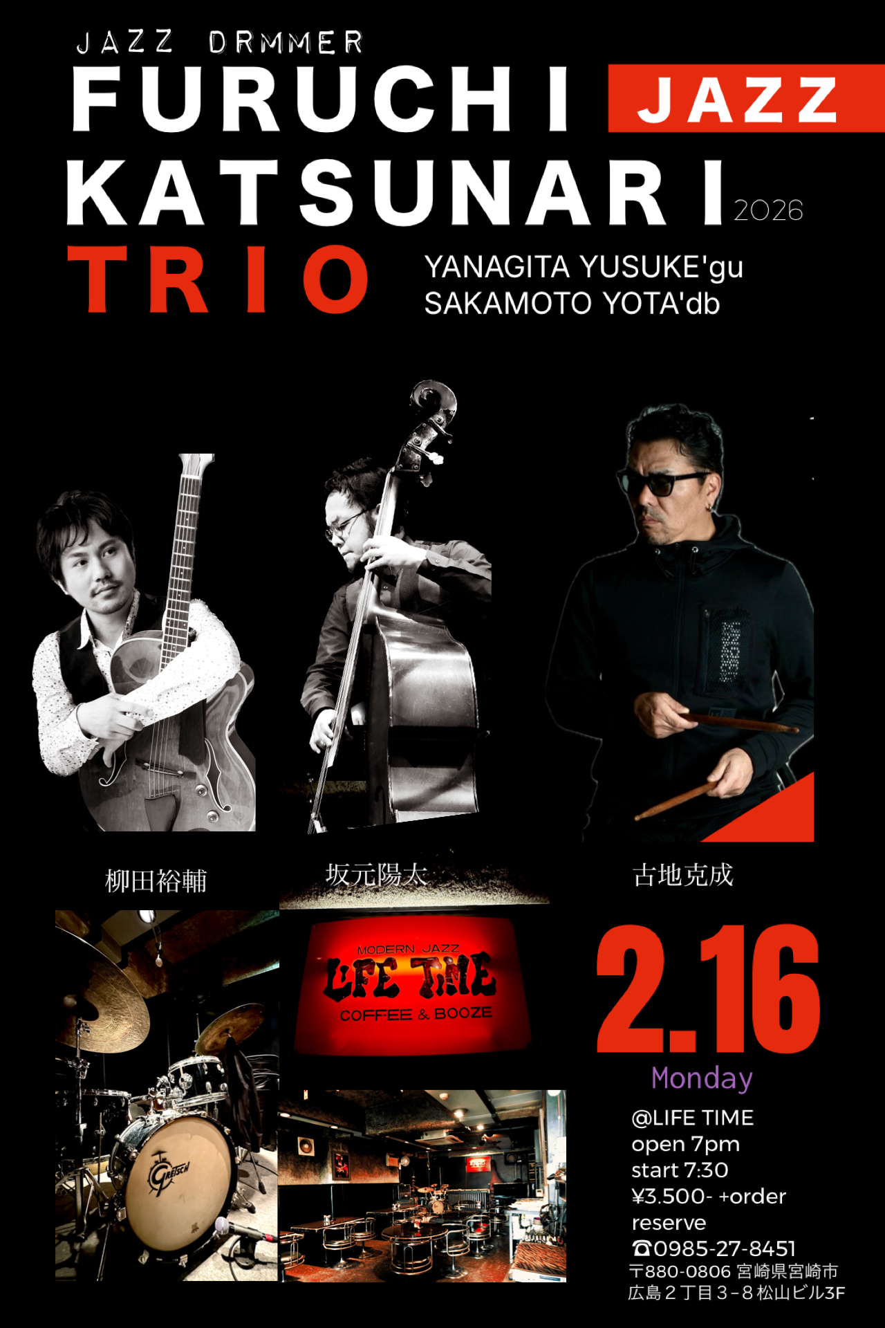 2026 2.16(Mon)@LIFE TIME miyazaki 出演 古地克成(ds)TRIO 柳田裕輔(gu)坂元陽太(db)