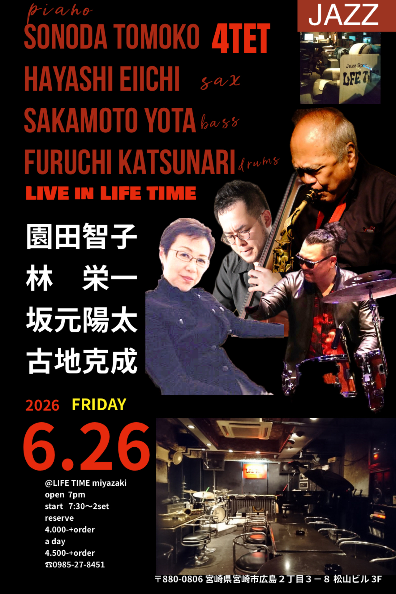 2026 6.26(FRI)@LIFE TIME miyazaki 出演 園田智子(pf)4TET 林栄一(db) 坂元陽太(db)古地克成(ds)